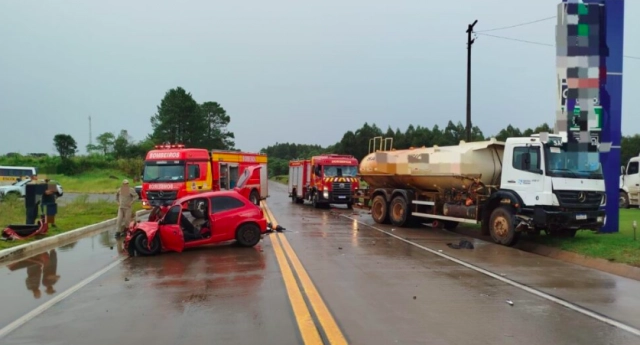 De acordo com o Corpo de Bombeiros Militar, um veículo GM/Celta colidiu lateralmente contra um caminhão e, na sequência, bateu frontalmente contra um segundo caminhão. No automóvel estavam duas pessoas.