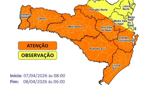 A aproximação e o avanço de uma frente fria por Santa Catarina provocam temporais entre a manhã de terça-feira, dia 7, e a madrugada de quarta-feira, dia 8, em todas as regiões do estado, com risco moderado a alto para ocorrências como destelhamentos, danos na rede elétrica, queda de galhos e árvores, além de alagamentos e enxurradas pontuais (veja o mapa acima).