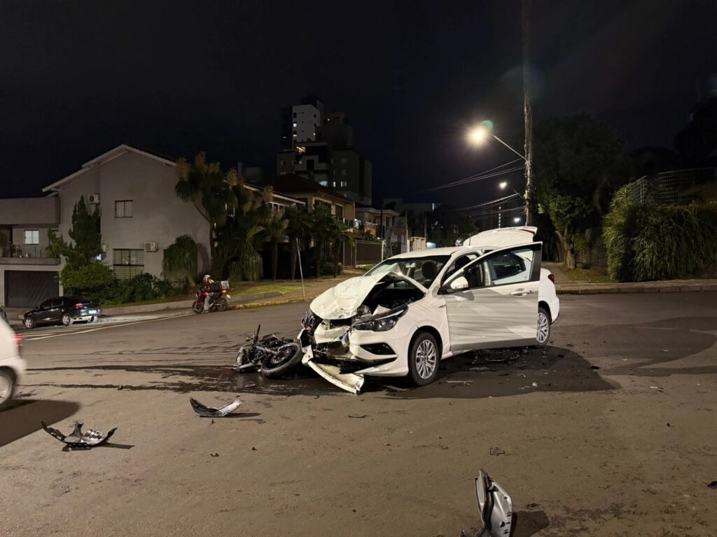 Um motociclista ficou ferido na noite de terça-feira (17) após uma colisão com um carro no cruzamento das ruas Borges de Medeiros e Rio de Janeiro, no bairro Presidente Médici. O acidente envolveu um veículo que seguia no sentido bairro–Centro e uma motocicleta que trafegava no sentido contrário.