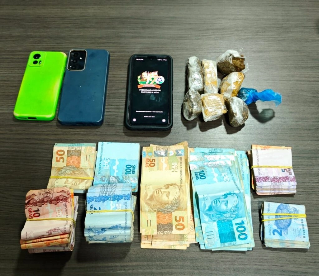 Ainda na averiguação, foram apreendidos R$ 9.585,00 em dinheiro, escondidos no fundo de uma lixeira, além de uma quantidade de cigarros de origem estrangeira, caracterizados como contrabando, quatro aves silvestres sem registro e três aparelhos celulares.
