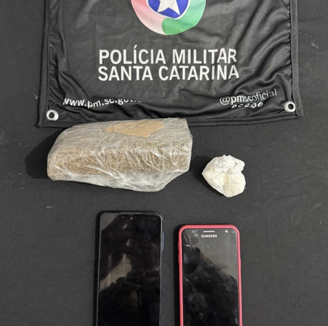 Durante a abordagem, os policiais localizaram aproximadamente 300 gramas de maconha e 21 gramas de cocaína, que haviam sido dispensadas em via pública.